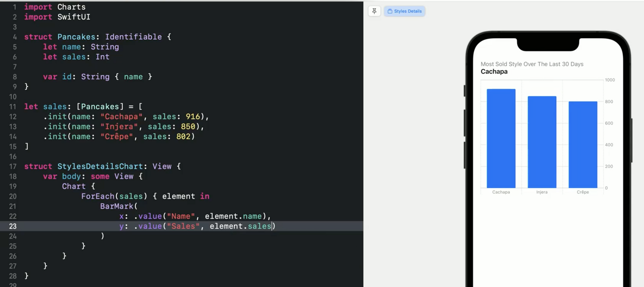 Swift Chart는 자동으로 바를 생성해서 우측 preview에 보여준다.