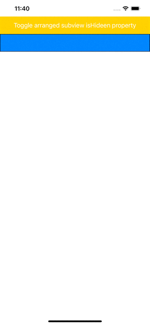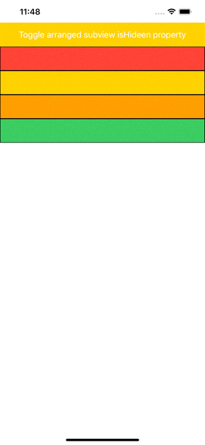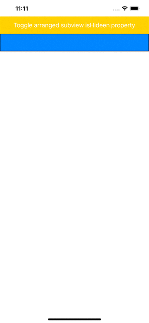 isHidden프로퍼티가 변경될 때 자동으로 레이아웃을 업데이트한다.// Appears to remove the first arranged view from the stack. // The view is still inside the stack, it's just no longer visible, and no longer contributes to the layout. let firstView = stackView.arrangedSubviews[0] firstView.isHidden = true3. Stack view의 어떤 프로퍼티라도 변하면 자동으로 이에 반응해서 업데이트한다.