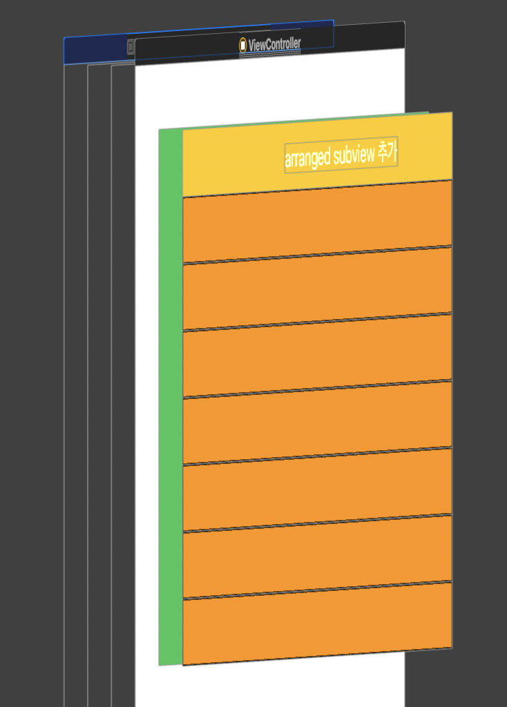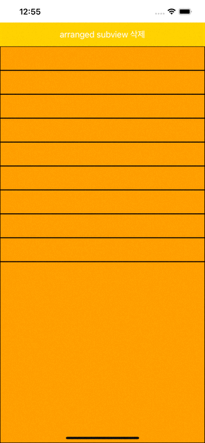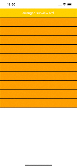 private func setupStackView() { stackView = UIStackView() stackView.translatesAutoresizingMaskIntoConstraints = false stackView.axis = .vertical stackView.backgroundColor = UIColor.systemGreen view.addSubview(stackView) let button = createButton() stackView.addArrangedSubview(button) // 처음에 10개의 뷰를 추가했다. for _ in 1...10 { stackView.addArrangedSubview(createSomeView()) } stackView.topAnchor.constraint(equalTo: view.safeAreaLayoutGuide.topAnchor).isActive = true stackView.leadingAnchor.constraint(equalTo: view.leadingAnchor).isActive = true stackView.trailingAnchor.constraint(equalTo: view.trailingAnchor).isActive = true } // subview 더하는 버튼 private func createButton() -> UIButton { let button = UIButton() button.translatesAutoresizingMaskIntoConstraints = false button.backgroundColor = UIColor.systemYellow button.setTitle("arranged subview 추가", for: .normal) button.addTarget(self, action: #selector(didTapRemoveButton), for: .touchUpInside) button.heightAnchor.constraint(equalToConstant: 50).isActive = true return button } @objc private func didTapRemoveButton() { guard let view = stackView.arrangedSubviews.last else { return } stackView.removeArrangedSubview(view) view.removeFromSuperview() } // 내부에 추가할 뷰 private func createSomeView() -> UIView { let view = UIView() view.translatesAutoresizingMaskIntoConstraints = false view.backgroundColor = UIColor.systemOrange view.layer.borderColor = UIColor.black.cgColor view.layer.borderWidth = 1 view.heightAnchor.constraint(equalToConstant: 50).isActive = true return view }